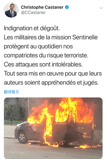 其中一辆被烧毁的汽车属于法国反恐部队Sentinelle。内政部长卡斯塔纳(Christophe Castaner)在Twitter上表达了他的“愤怒和厌恶”