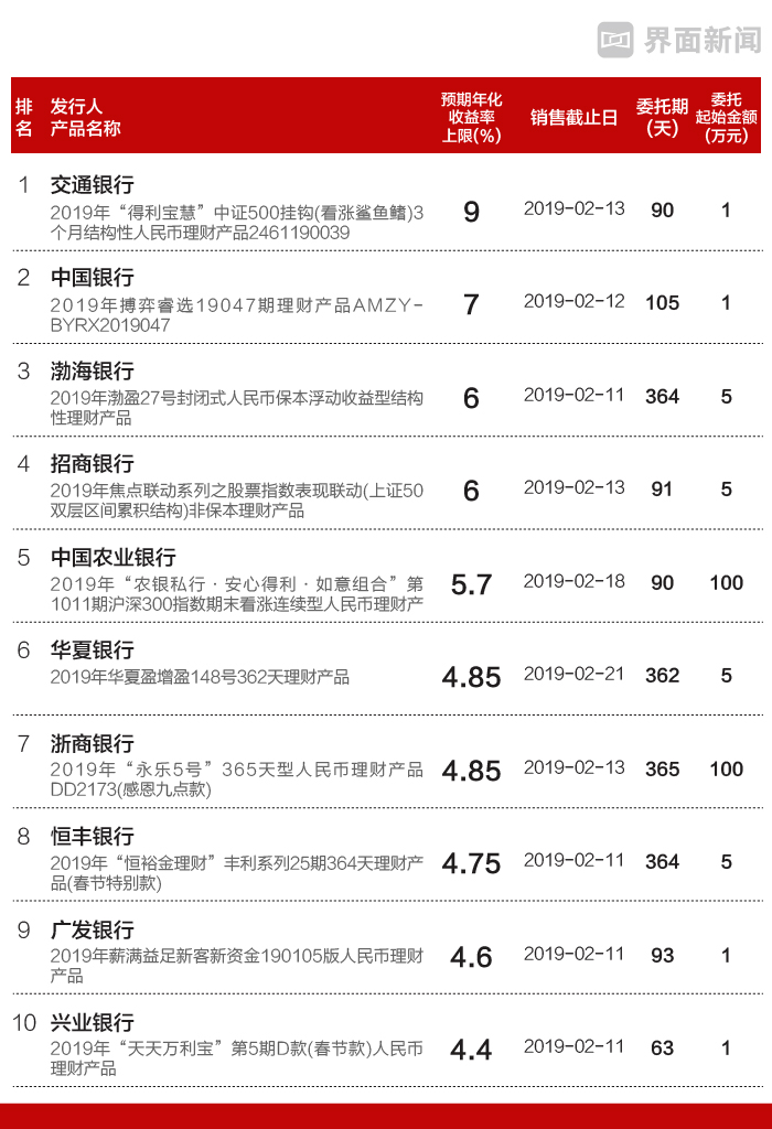 来看看本周有哪些可以挑选的银行理财产品。本周,18家国有商业银行和股份制商业银行全国范围在售针对个人的人民币理财产品182只,其中未包含结构性存款银行理财。界面新闻从每家筛选了收益率最高、最值得关注的理财产品,共10只。