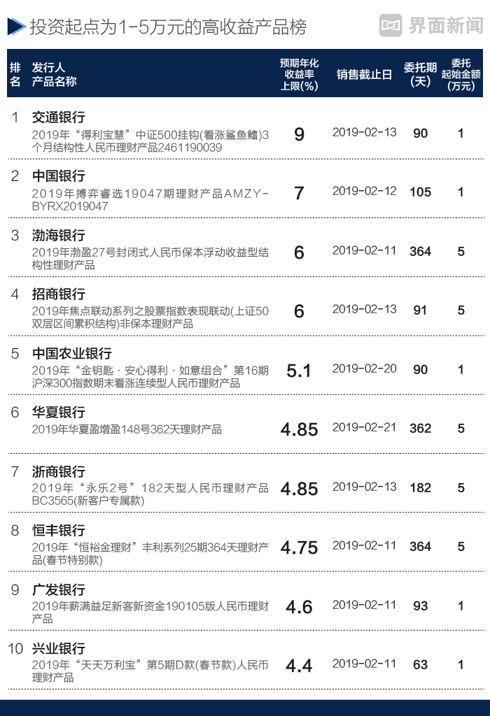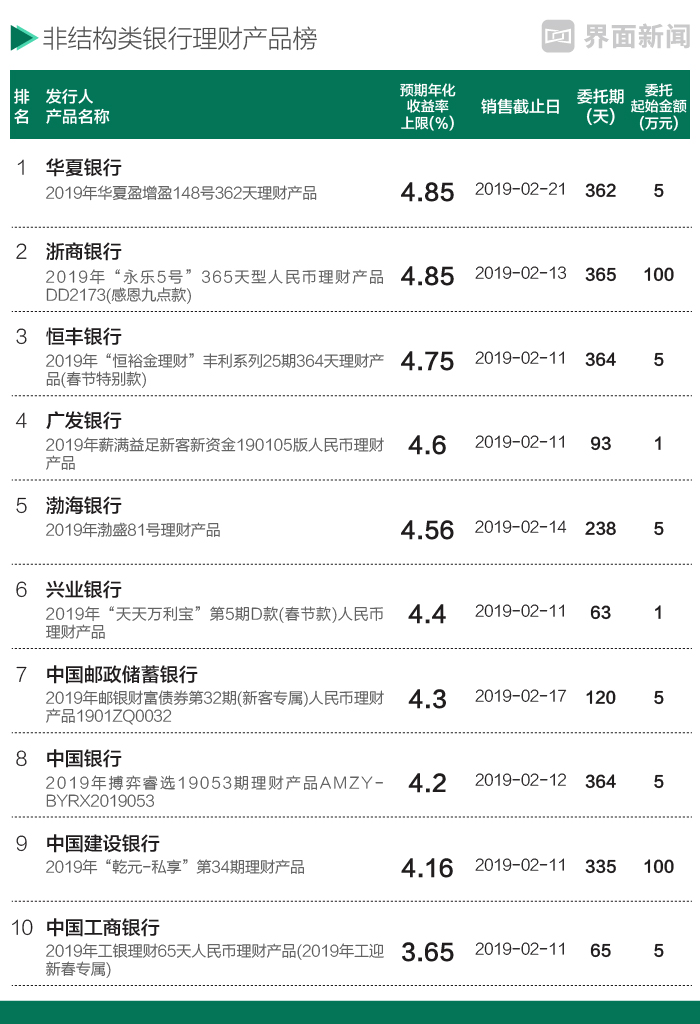 考虑到投资者的拟投资金额、风险偏好不同,本期还对起点为1至5万元的银行理财产品以及抛去结构化产品收益复杂设置、收益相对稳定的非结构类理财产品进行筛选,做成榜单,供投资者参考。