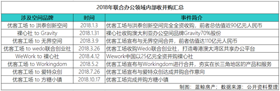 随着联合办公行业蓬勃发展,“百家争鸣”的联合办公行业也迅速进入洗牌期,“大鱼吃小鱼”的收并购现象逐渐增多。据蓝鲸房产不完全统计,截至2018年末,联合办公行业在2018年已发生8起并购案例。