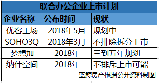 早在2018年5月,优客工场创始人毛大庆曾对媒体表示,“公司一年内就将实现盈利,预计将在今年或者明年年初上市,地点是香港和上海二选一。”; SOHO3Q在更早时候也放出了上市宣言,SOHO董事长潘石屹于2018年3月表态,未来不排除拆分联合办公业务独立上市的可能。;梦想加创始人李文磊也在2018年8月一次访谈中表示,梦想加正在加速扩张,三到五年内有上市的计划。纳什空间创始人张剑也曾表示,不排斥上市可能性。