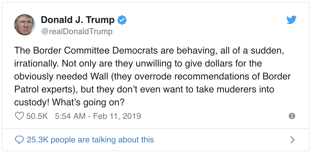 “边境委员会的民主党人突然表现得毫不讲理。他们不但不愿给钱修建明显需要的边境墙,甚至还不想将杀人犯收监!到底发生了什么?”特朗普周日在推特上写道。