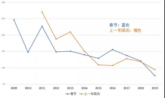 据文化和旅游部,2019年春节假期,全国旅游接待总人数4.15亿人次,同比增长7.6%。从下图可以看到,该增速为次贷危机以来的新低,且首次跌至个位数。