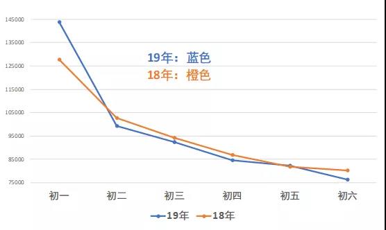 我们来看看,春节档期间票房的变化。从下图可以看到,2019年春节档票房之所以能够小幅超过18年,主要得益于大年初一,2019年比2018年高了1.62亿元,随后2019年几乎每天都比2018年低,尤其是初六,低了4000万。这反映出,市场本来对2019年春节档寄予厚望,但是初一观影之后,热门电影口碑不佳,票房高开低走。