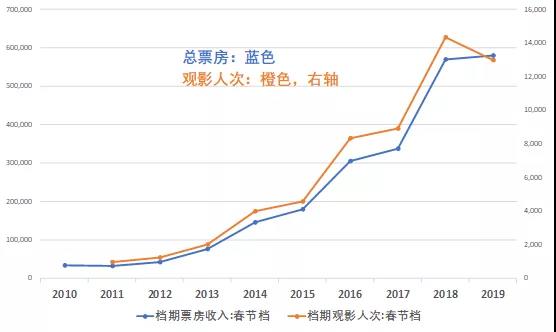 再来看一下春节档票房的变化。从下图可以看到,2019年年春节档电影总票房58亿,已超去年,但是观影人次1.3亿,同比下降10%,这也是2011年以来,观影人次首次出现下降。这也就意味着,2019年票房的小幅提升,主要得益于票价的上涨。