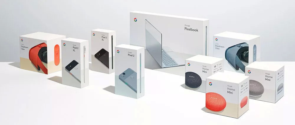 去年推出的Made by Google系列产品包装设计简洁且美观,利用摄影作品展示产品。此次设计的重点是开发一种品牌视觉语言,既能表达Google的品牌价值,也能体现新硬件产品的工业设计。包装充斥着极简主义,定义一种突出产品设计和促进品牌认知的设计风格。为了实现这种设计Google使用了一种全新而独特的产品摄影风格,通过强烈的光线突出产品,创造独特的投射阴影。在所有包装中,图像都以动态角度显示,用以突出主要产品功能。