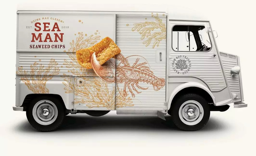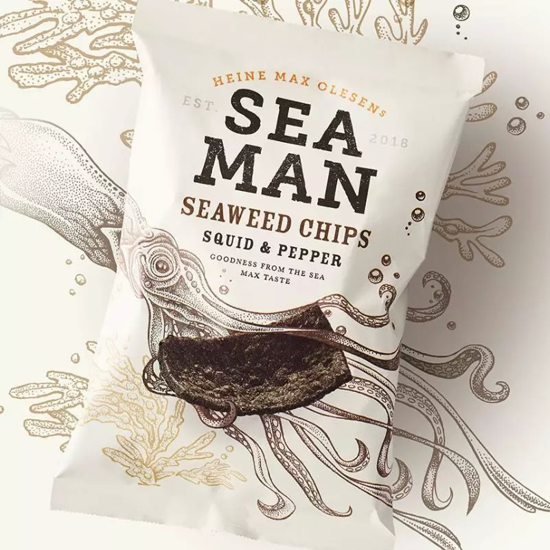 Sea Man海藻脆片是一款健康且可持续的薯片替代品,由一种叫做bladderwrack的养殖海藻制成。Pearlfisher为这个革命性创新食品品牌设计了这款出色的包装。