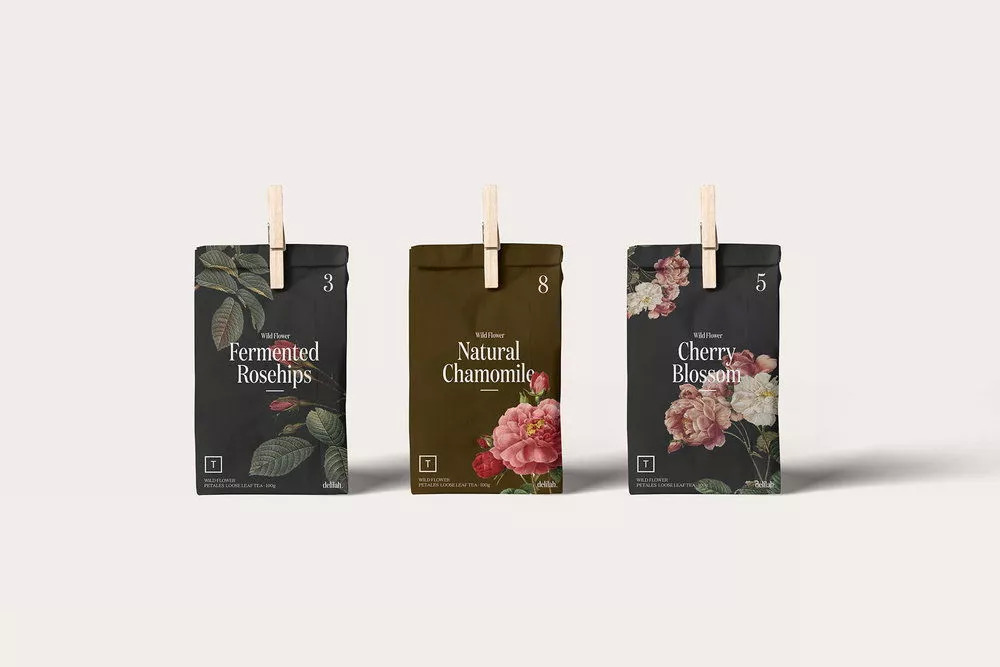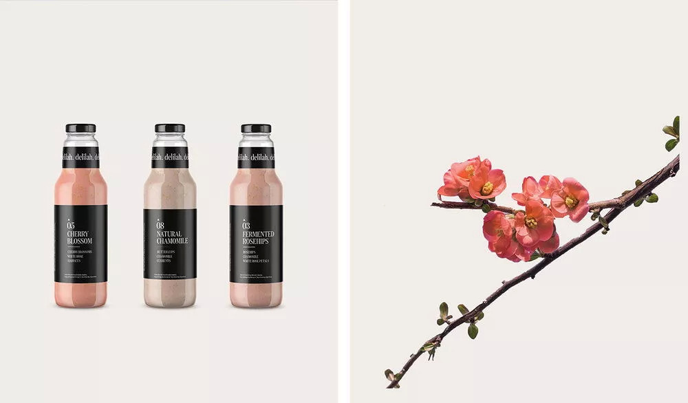 Delilah的独特果汁由可食用花卉和水果混合而成。包装设计体现品牌标识,图案包含简洁的食用花卉和富有春天气息的场景。