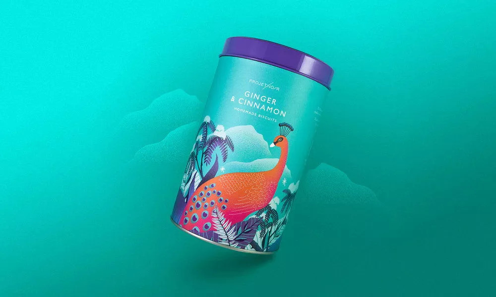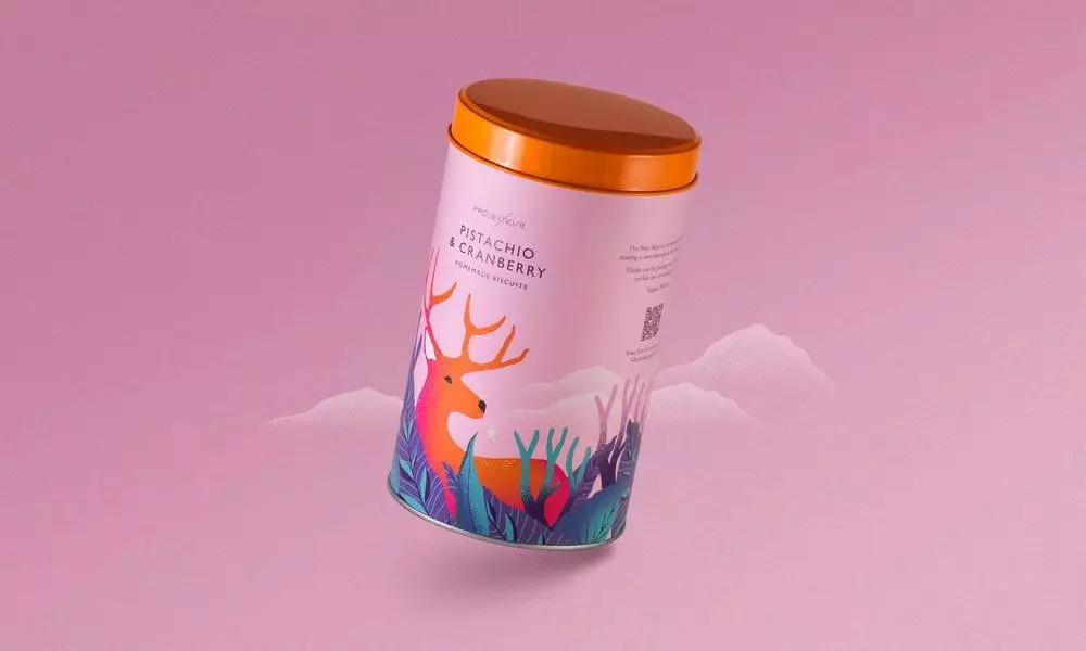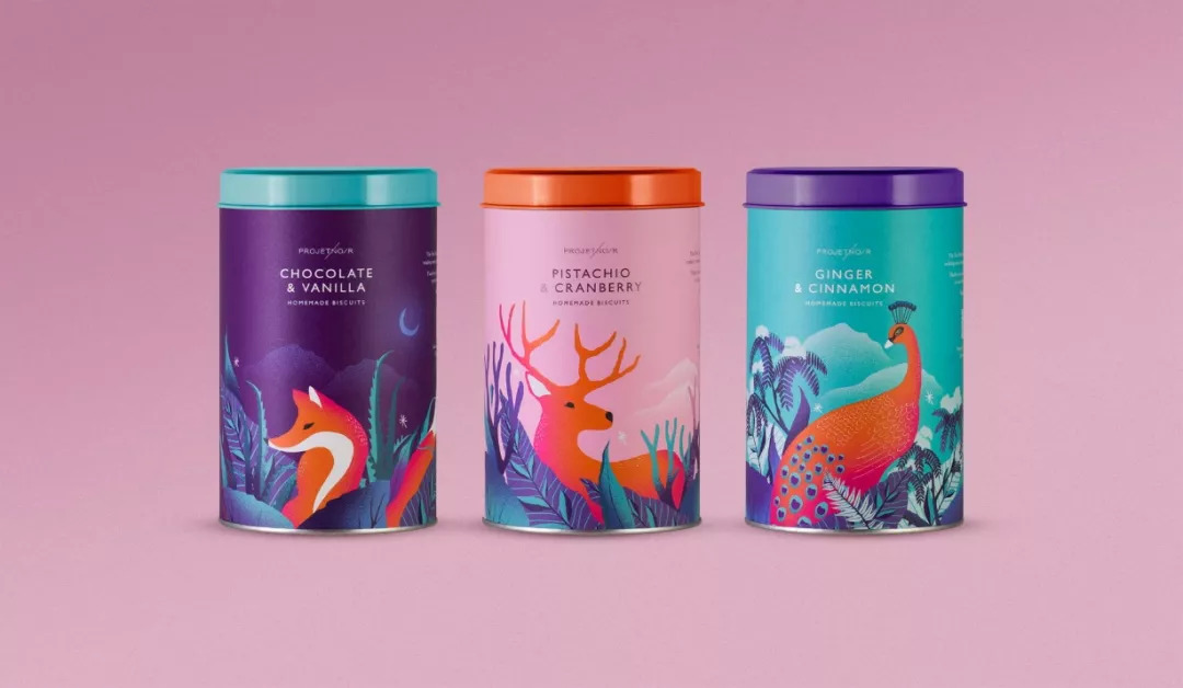 饼干罐上的定制插图描绘出野生动物的形象:卡斯克德山狐,红鹿和充满异国风情的印度孔雀,运用丰富的色彩打造出田园诗般的梦幻氛围,超现实的植物形象增添了奇幻的元素。同时Projet Noir的设计细节为品牌消费者提供了良好的体验,罐身的二维码可以下载相应的图画作为壁纸,随时随地在手机或电脑中欣赏这些艺术品。