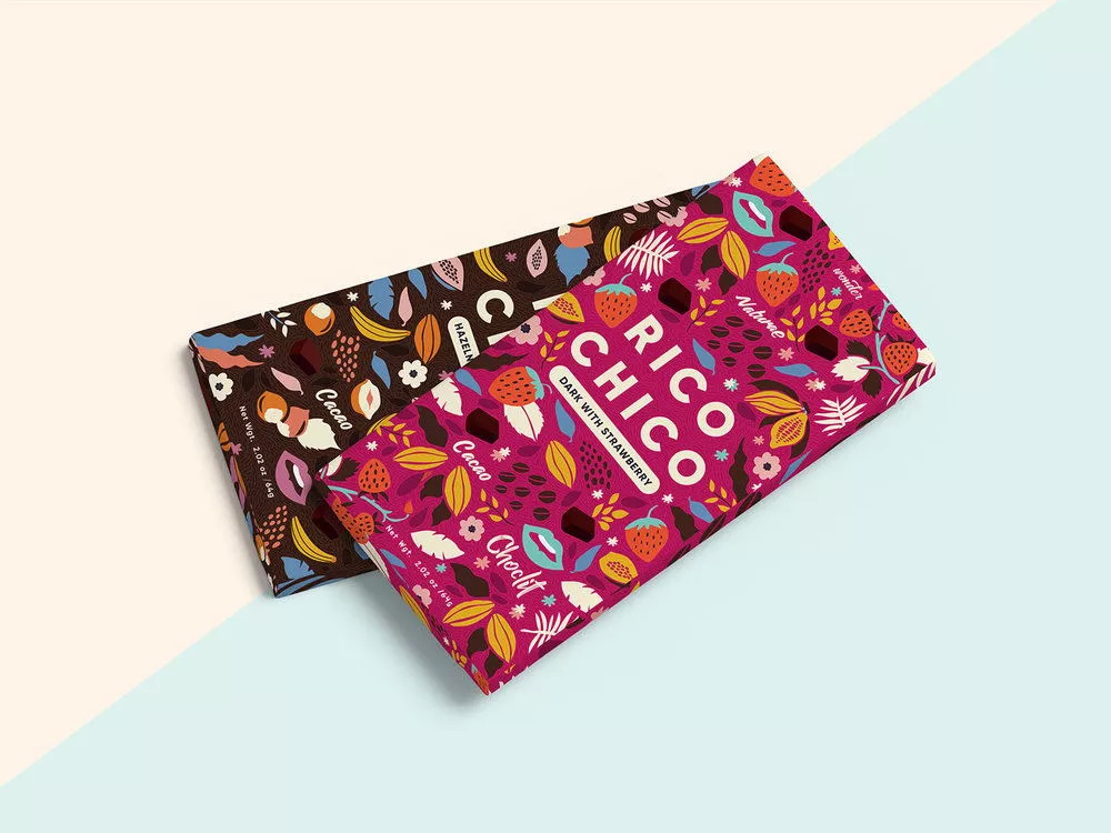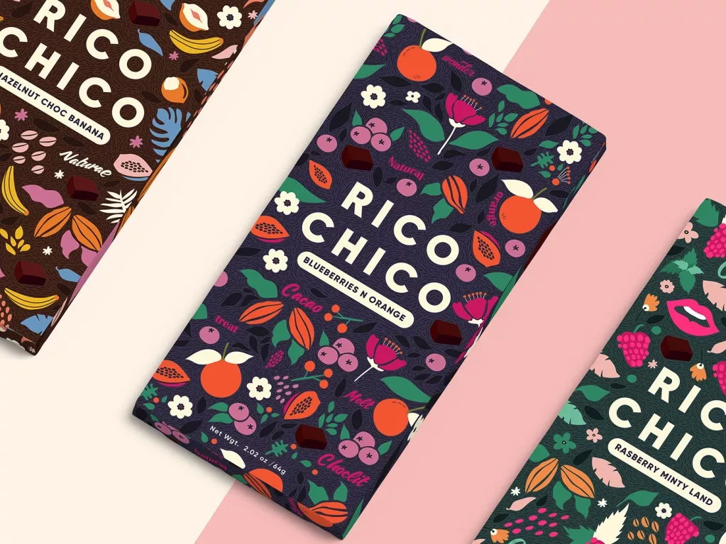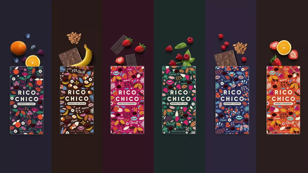 Rico Chico的品牌包装设计,捕捉到产品中特有的浓郁可可和天然果味。这一系列巧克力包含6种不同的水果口味,为消费者提供风味各异的高品质食用体验。