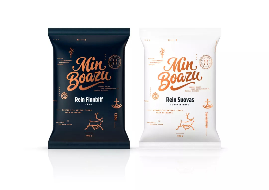 谁能想到驯鹿肉的包装可以这么好看? Str mme Throndsen为专门生产驯鹿肉类产品的挪威品牌Min Boazu打造了这款优雅的包装。颜色结合深蓝色和对比鲜明的白色和铜色,突出每个细节,体现出挪威北部无尽冬夜,纯净的夏日光线,以及卓越的产品质量。