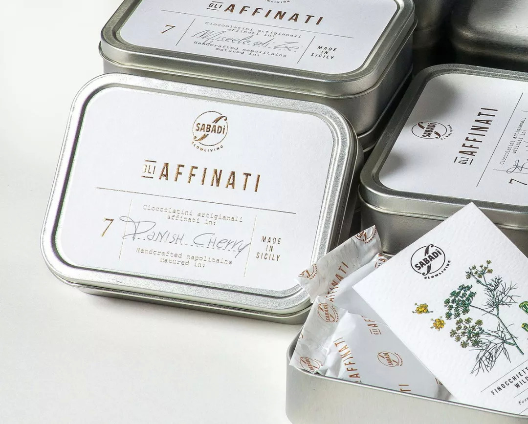 GLI AFFINATI巧克力采用纤巧的锡罐包装,白色标签饰有金色浮雕字体,体现品牌、巧克力的类型及其制作地点。这一革命性产品设计时尚优雅,完美体现了品牌的座右铭“少即是多”。