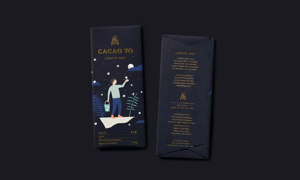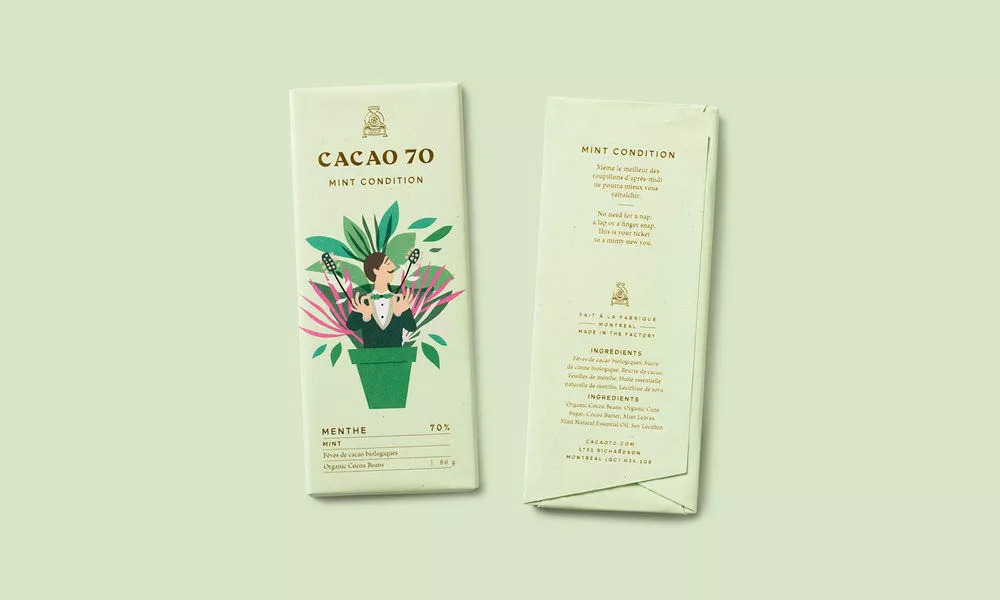 Cacoa70旨在用实惠的价格提供高品质巧克力。Cacoa70没有专注于成分的来源,而是希望给不同风味的巧克力赋予个性和故事。在包装设计中,正面的图案和文字展现每个口味的特性,并在背面附上简短的故事。