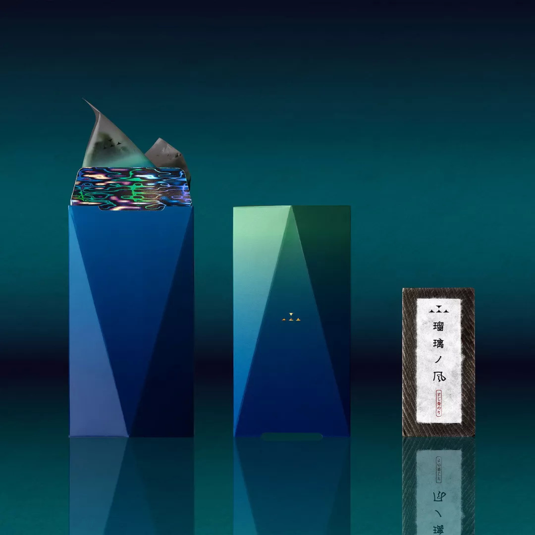 Wind of Ruri为消费者提供具有强烈香气和绝佳风味的高级日本绿紫菜(浒苔),原材料只取自德岛的吉野河的特定渔业区域。包装设计中采用的“多面体”形状,灵感来自吉野川的美丽水面。从中心的孔中看到的银叶材料,特别是用波浪形图案处理,同样代表了水的表面。整体设计中日本经典标志和前卫包装形式的结合体现了传统与现代的融合。