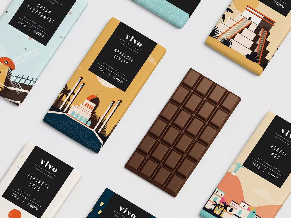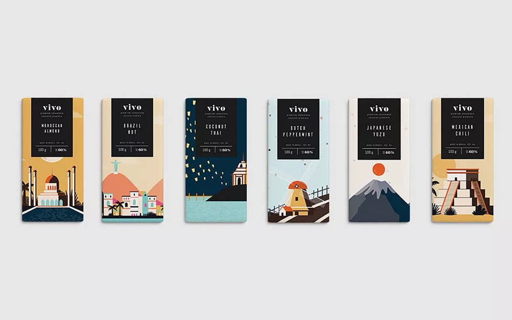 Vivo是来自巴西的手工制作巧克力品牌。品牌坚持从原产地采购主要原料,将不同的主要原料与巧克力结合,创造出独特的风味。Vivo这个名字代表了巧克力所带来的绝妙体验,愉快而生动。而在包装上,品牌则选择了以知名的城市或风景为原型的彩色插图,借此创造出一系列令人印象深刻的巧克力包装。