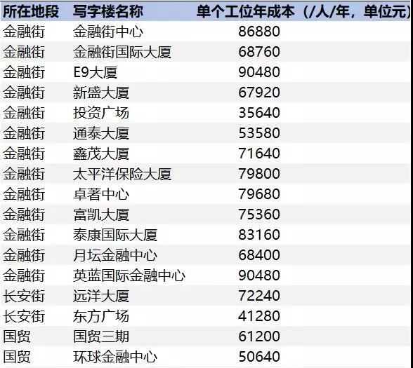 最后,附上热门办公楼的单个工位年成本(按每月30天、人均工位10平米计算),在忐忑我与工位孰贵的朋友们,欢迎自查~