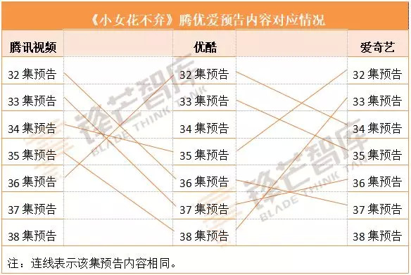 通过观察近期热播的多部内容,预告乱象可谓数不胜数,以《小女花不弃》为例,腾讯视频第32集预告与优酷第36集预告、爱奇艺第37集预告实际内容相同,不同平台预告内容之间相互错位现象十分突出。
