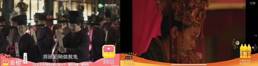 而后,视频平台还能利用预告片进行广告位招商,在平台、制作方、品牌主们为有限的片头口播、中插剧场、角标贴片等正片广告植入头疼不已时,预告片中的包框广告也成为了广告界的香饽饽。腾讯视频在《知否》的预告中贴上了美柚App;优酷在《知否》预告中贴上了美汁源果粒橙;爱奇艺在《皓镧传》预告中贴上了麦吉丽……资本对预告片植入的认可,是预告片价值的最好体现。