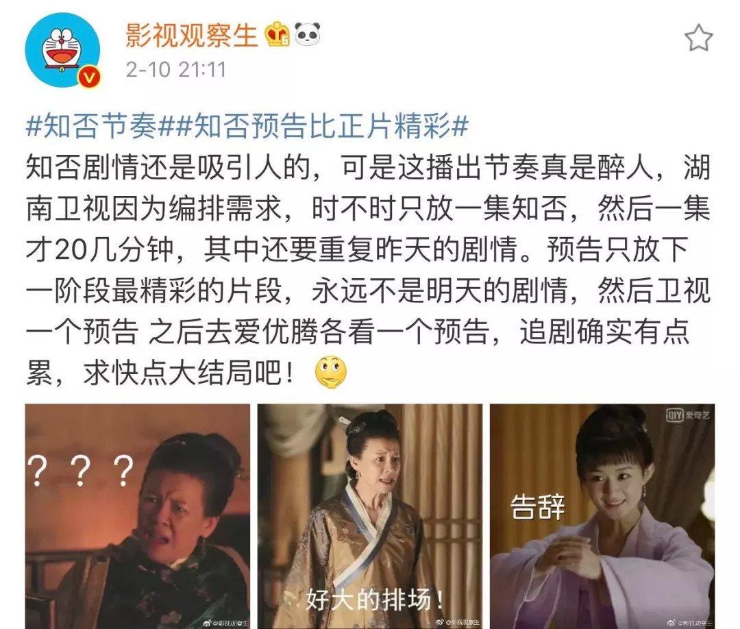 除了过度剧透,预告的前后颠倒、错位提前同样在过度消耗用户的耐心。适当预告能够充分调动用户的好奇心,为内容传播造势形成助力,但过度前置则会令用户在期待中反复落空,产生剧情发展缓慢、节奏拖沓之感,从而逐渐产生疲态、失去热情。