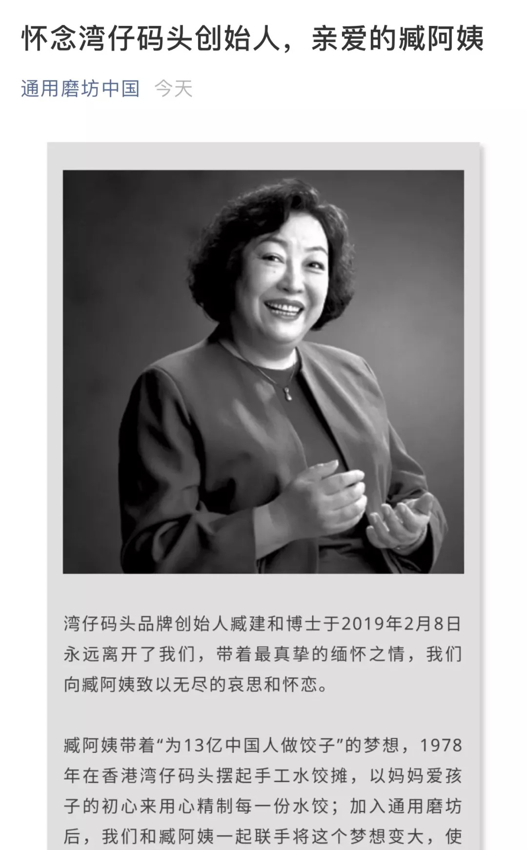 在这份名为《怀念湾仔码头创始人,亲爱的臧阿姨》的讣告中,通用磨坊表示: