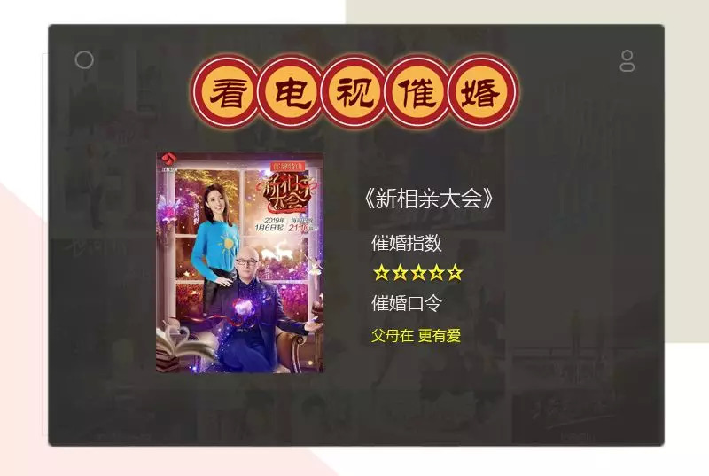 2019年,江苏卫视开年钜制了一档以子女带父母一起相亲为表现形式的代际相亲节目,《新相亲大会》,打着“父母在,更有爱”的旗帜,直接带着父母亲朋一起参加相亲。