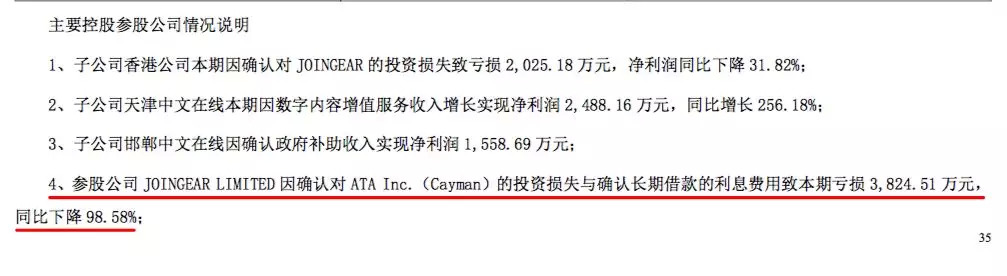 在2015、2016年间,中文在线以自有资金3160万美元投资ATA,间接持有ATA Inc 20.09%股份。在不断加码下,中文在线不仅没有获利反而损失惨重。其在2017年财报中也披露,由于对ATA Inc.的投资损失以及确认长期借款的利息费用,导致中文在线亏损近4000万元。