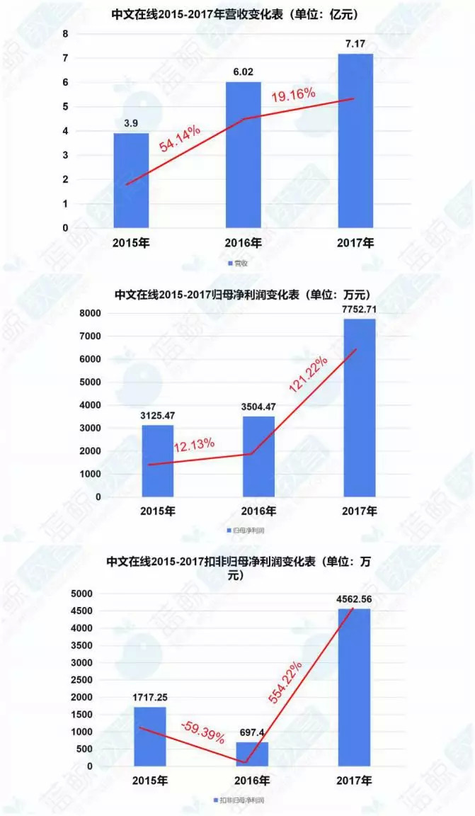 如图所示,中文在线2016年的经营状况在2015-2017年中最差。2017年的经营状况相比于2016年,类似于“触底反弹”:营收增速虽然明显下降,但净利润却同比增长超100%、扣非净利润增长幅度更是达到了惊人的500%——其主营业务盈利能力大大增强,且成本控制能力有了明显提升。