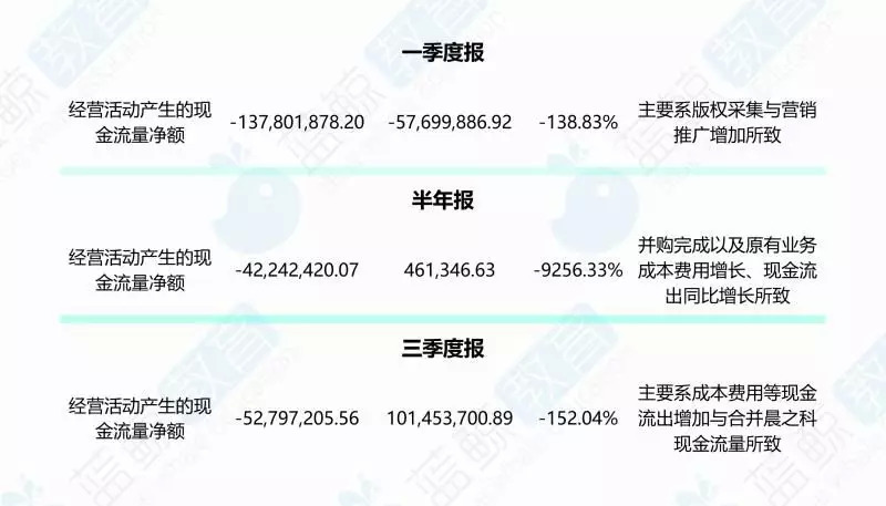 还有一项财务数据值得广大投资者关注:中文在线2018年前三季度经营活动产生的现金流量净额均同比去年大幅下降,尤其是半年报中降幅达到了骇人的-9256.33%。而中文在线给出的变化原因中,大多与(成本)费用增加、并购有一定关系。