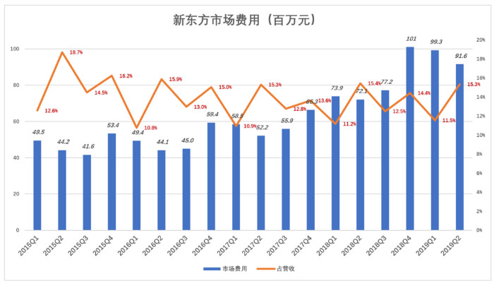 饶是如此,新东方市场费用的绝对值也相当惊人,最近三个自然季(2018年Q2、Q3、Q4)分别为1.01亿美元,9930万美元和9160万美元。