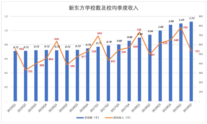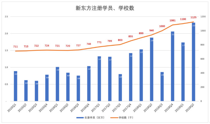 2015财年Q1(截至2014年8月31日),新东方注册学生88.8万,学校711所;2019年Q1,注册学生和学校数分别为173.5万和1100所。