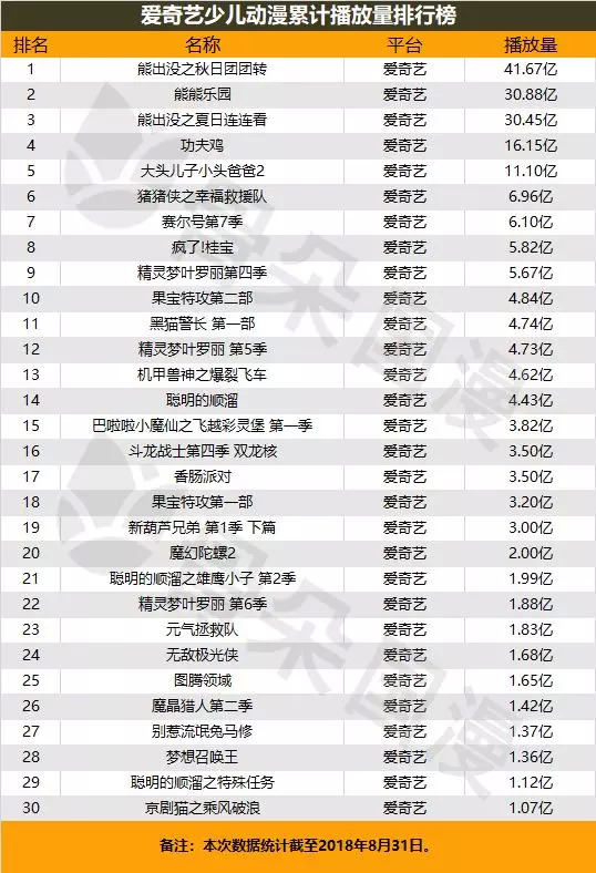 爱奇艺少儿动漫榜单中,《熊出没》系列占领前三,共有累计播放量41.67亿、30.88亿和30.45亿。榜单前五名累计播放量均超过十亿。
