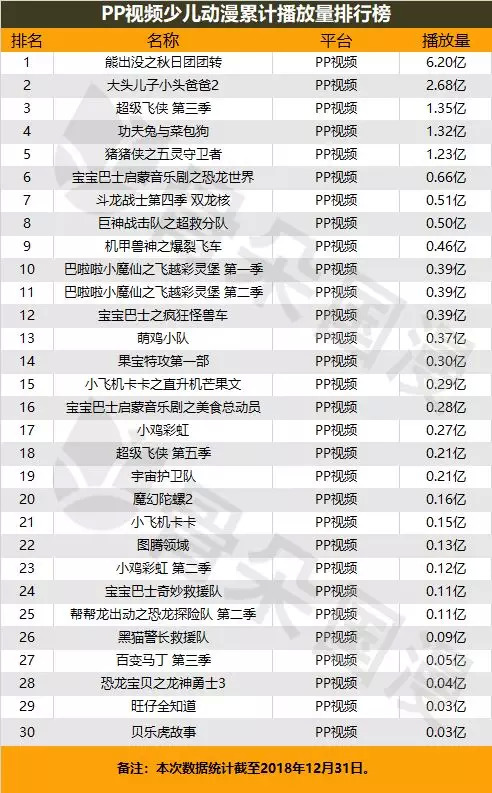 PP视频少儿动漫累计播放量榜单中,位列前三的是《熊出没之秋日团团转》、《大头儿子小头爸爸2》和《超级飞侠 第三季》。该平台前五名累计播放量均超过一亿。