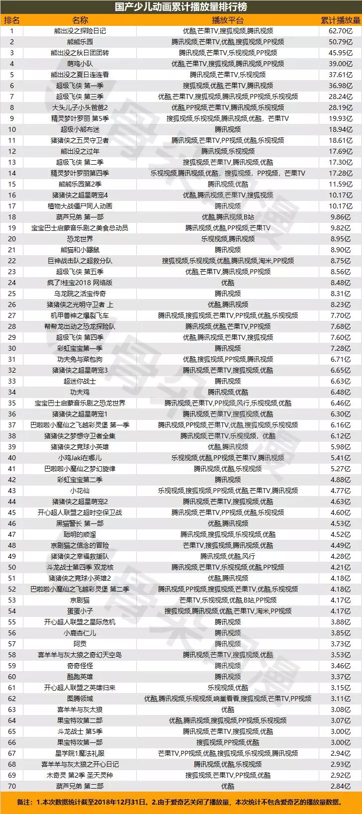 而由于爱奇艺已在2018年9月关闭前台数据显示,本次统计不包含爱奇艺平台的播放量数据。