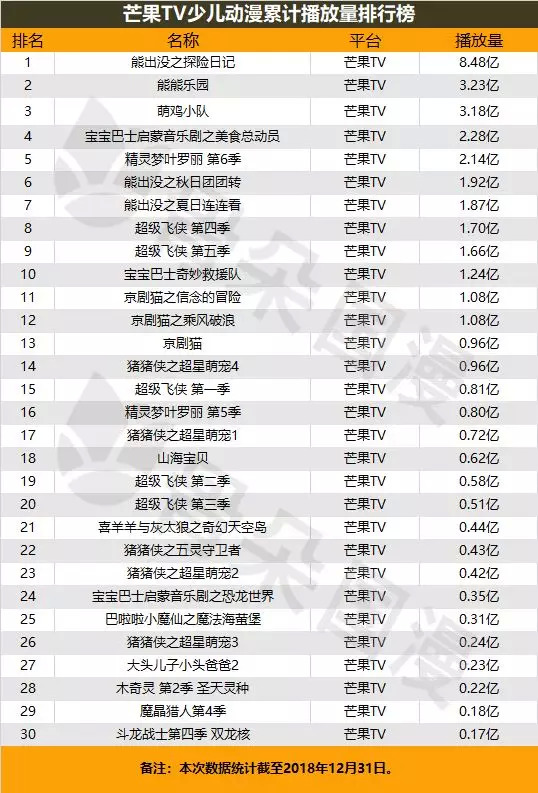 芒果TV平台上,位列第一的依然是《熊出没之探险日记》,共有8.48亿的累计播放量,第二名《熊熊乐园》累计播放量3.23亿,《萌鸡小队》以3.18亿的累计播放量紧随其后。
