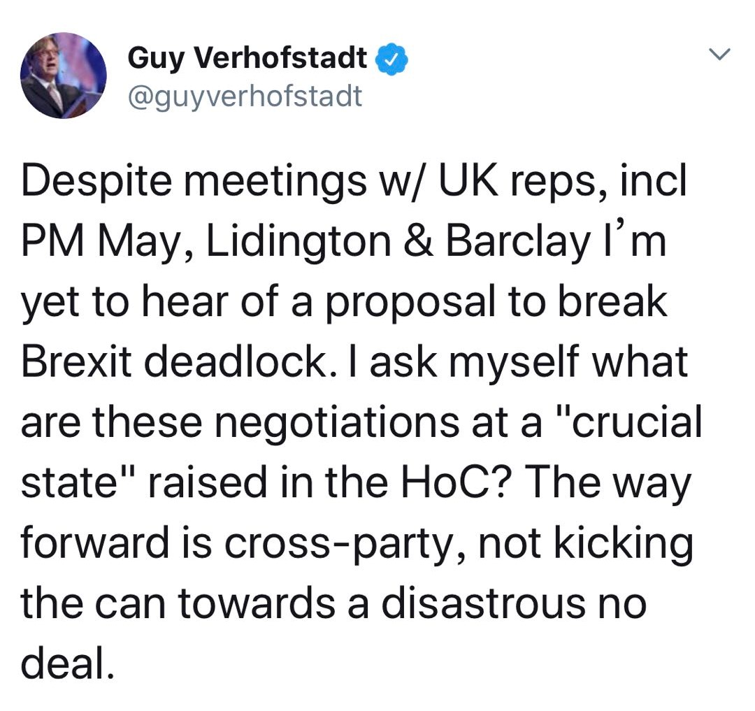 然而欧盟议会的英国脱欧专员Guy Verhofstadt则在推特上表示:“虽然和包括梅在内的英国代表见了面,但目前仍未听到可以打破僵局的建设性提议。 我不得不问自己,梅在议会下院所说的关键阶段的谈判到底是啥?想要达成协议必须多党合作,而不是一再推延到最后变成灾难性的无协议脱欧。”