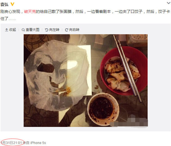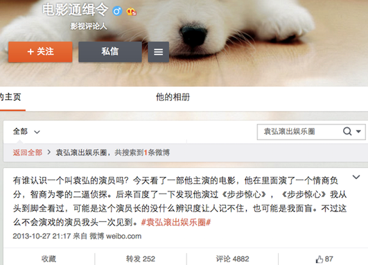 不过这个话题,并不是在今天恋情曝光时才有的,实际上是2年前一位影评人对袁弘主演的一部电影发表的评论(好想知道是哪部烂片)。