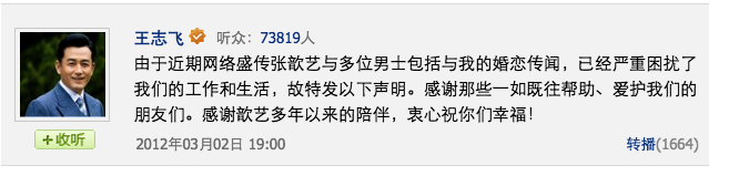 2012年初,王志飞突然通过微博发表声明,宣布与张歆艺结束恋人关系。关于两人的分手原因,有两种说法,一种是“逼婚不成说”,就是张歆艺的母亲曾透露,王志飞一直不肯结婚,张多次逼婚未果才决定分手的。另一种则是王志飞声明中的言外之意——