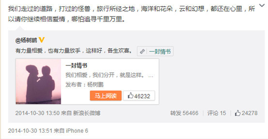 没错,当时张歆艺还没有和导演杨树鹏离婚。不过,10月底,两人就在微博上宣布和平分手了,这在当时还被誉为“一别两宽,各生欢喜”的当代典范(也是醉了)。