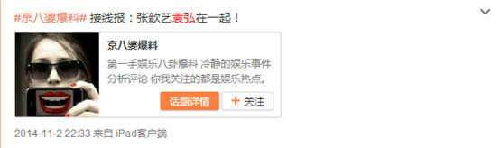 在两人恋情曝光后,“袁弘滚出娱乐圈”的话题也上了微博热搜榜。