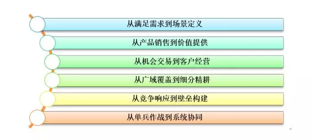 在这样一个背景下,企业应该怎么办?因为时间有限,我就不推导过程了,直接讲结论。未来的营销会从满足需求到场景定义,以后任何一个产品的研发,如果不能定义场景,不能响应这个场景中顾客的痛点和爽点,那么这个产品从一开始它的DNA就是错误的。上午听到孙波老师讲,人力资源管理要回到工作场景中去,我觉得这个观点到位,这就是感性的认知、理性的节奏,认知应该是感性的,所以我讲课尽量不用太多的术语,尽量不用太复杂的模型。