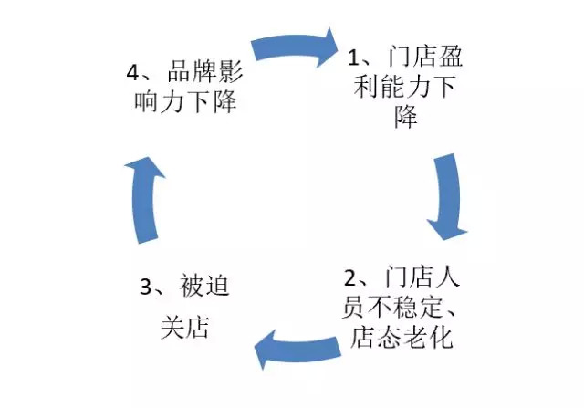在终端层面的核心问题是终端门店盈利能力下降,甚至亏损,终端门店陷入恶性循环,引流效率低、成交率低、客单价低、转介绍率低。