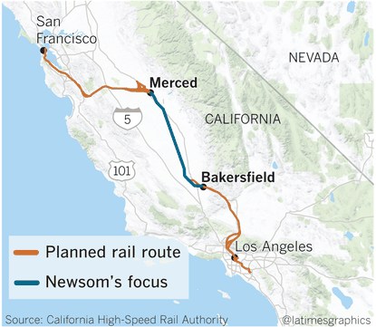 在新的规划里,加州仅会完成一条长度191公里的高铁项目,位于以农业为主的中央山谷地区(Central Valley),连接默塞德和贝克斯菲尔德。按照《洛杉矶时报》的计算,这一小段高铁的成本约为150亿美元,较原定数额缩水约八成。