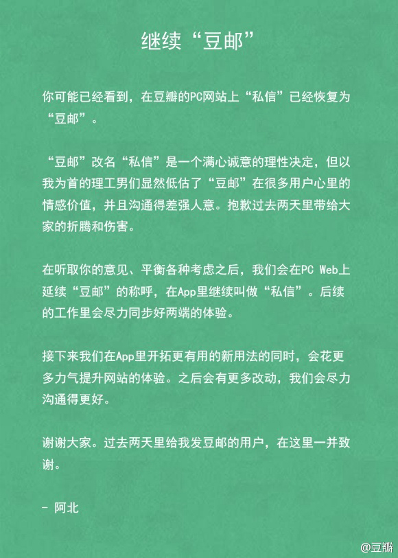 5月20号傍晚,豆瓣网在其新浪微博主页上刊登了一封创始人阿北致用户的信,标题是——“继续豆邮”。