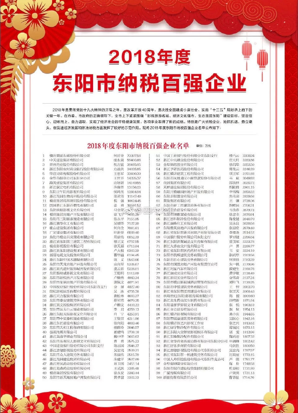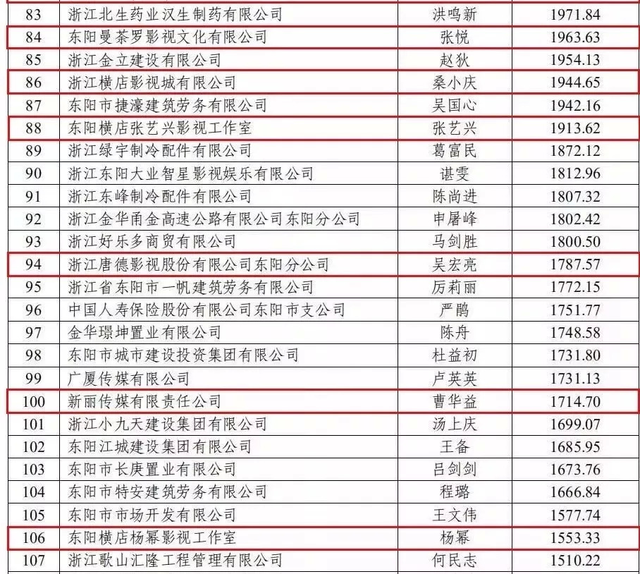 东阳市公布的2018年企业纳税榜和纳税百强企业中,横店影视、华谊兄弟、正午阳光、欢娱影视、新丽电视、盟将威影视、青雨传媒等多家影视公司都在榜单之上,其中华谊兄弟纳税额达到了3.26亿,欢娱影视、正午阳光的纳税金额也均突破了1亿。