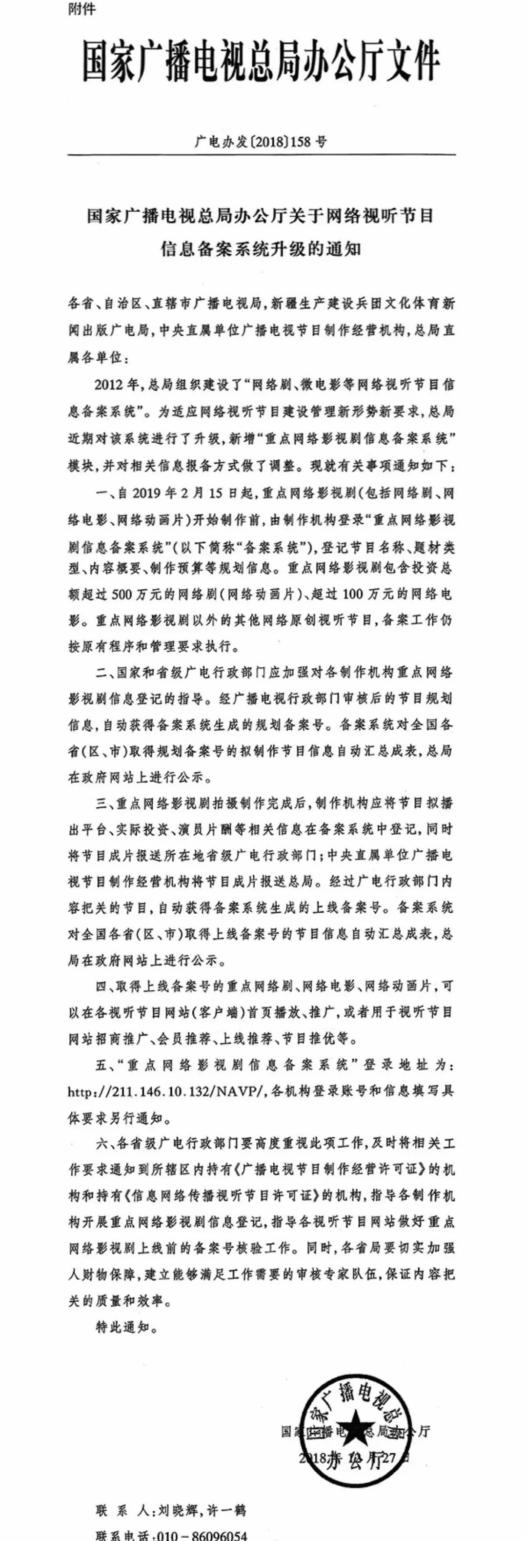 税改风波之后,相关部门针对娱乐圈的限薪令可谓密集出台。2018年12月,广电总局发布《关于网络视听节目信息备案升级的通知》,通知指出,自2019年2月15日开始,重点网络影视剧(包括网络剧、网络电影、网络动画片)开始制作前,要由制作机构登陆“重点网络影视剧信息备案系统”,登记节目名称、题材类型、内容概要、制作预算等规划信息。