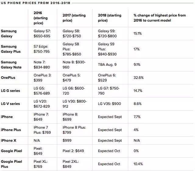 苹果一直通过iPhone的高端化稳定营收和利润,2007年首代iPhone是499美元起,2010年iPhone4是599美元,2012年的iPhone5是649美元,2016年iPhone6是749美元,2017年的iPhoneⅩ起步价达到了999美元,苹果ASP增速并非最快但绝对值是所有手机品牌中最多的。