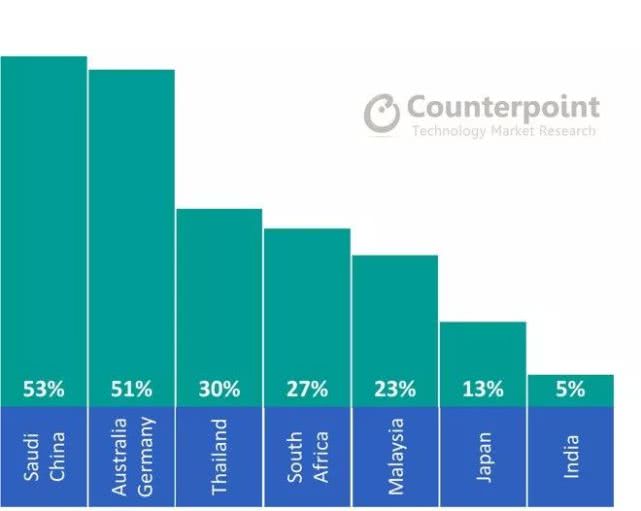 在国际市场上,日本市调机构AUNCON有个研究,人均收入越高的国家,IOS系统市场份额越高,瑞士、丹麦、挪威、瑞典都是如此,其他如美国、加拿大、澳大利亚、新西兰、日本、英国等等,北欧诸国只有芬兰例外,原因众所周知。Android份额最高的10个国家分别是埃及、伊朗、巴西、韩国、马来西亚、墨西哥、土耳其、泰国、印尼、印度,韩国在列的原因同样众所周知。