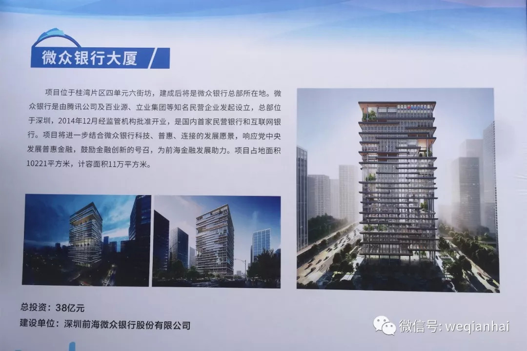 微众银行大厦项目占地面积10221平方米,计容面积11万平方米,总投资约38亿元。项目将进一步结合微众银行科技、普惠、连接的发展愿景,响应党中央发展普惠金融,鼓励金融创新的号召,为前海金融发展助力。