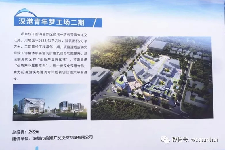 深港青年梦工场二期用地面积9688.41平方米,建筑面积2万平方米,总投资约2亿元。建成后将实现梦工场整体服务空间扩展及服务功能提升,建设前海片区的“创新产业孵化核”,打造香港“优势产业集聚平台”,进一步深化深港合作,助力前海加快粤港澳青年创新创业重大平台建设。