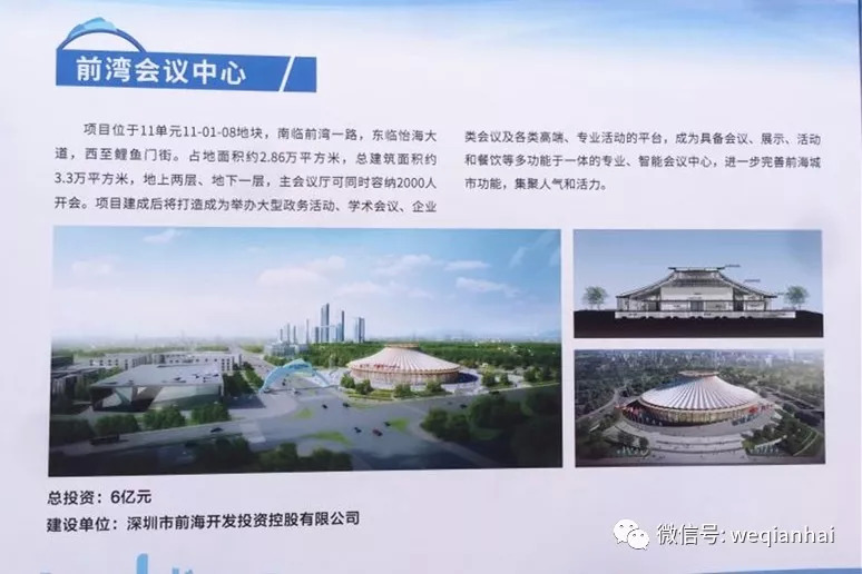前湾会议中心占地面积约2.86万平方米,总建筑面积约3.3万平方米,总投资约6亿元,地上两层、地下一层,主会议厅可同时容纳2000人开会。项目建成后将打造成为举办大型政务活动、学术会议、企业类会议及各类高端、专业活动的平台,成为具备会议、展示、活动和餐饮等多功能于一体的专业、智能会议中心,进一步完善前海城市功能,集聚人气和活力。